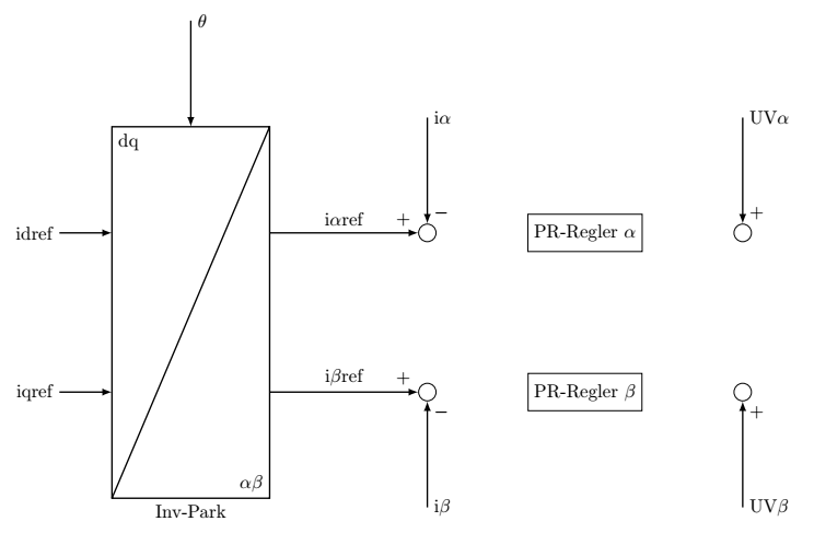 \node[draw,minimum width=3em,minimum height=2em] (pr) at (3,-3) {PR-Regler $\beta$};