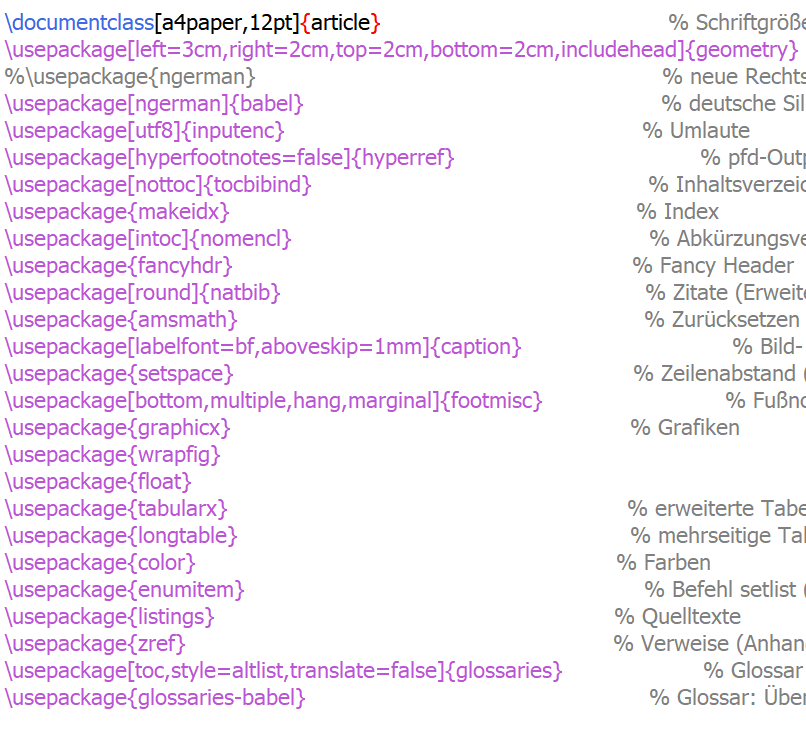 Die installierten Packages meiner Vorlage (ngerman ist deaktiviert, da es ansonsten auf Fehler läuft)