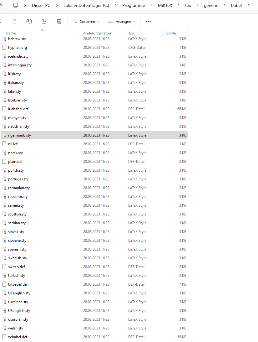 Interessanterweise funktioniert das Ganze wenn ich "[ngerman]" weglasse... Wenn ich im Verzeichnis: C:\Program Files\MiKTeX\tex\generic\babel schaue, sind zumindest einige .sty Dateien vorhanden (auch ngermanb), falls das überhaupt eine Aussagekraft hat...