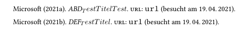 Nun folgt eine Passage mit Onlinequellen (Dokumentation von Microsoft), wo hier der Autor natürlich immer der selbe ist [Microsoft 2021a, Microsoft 2021b, etc.], hier ist aber die Anordnung im Literaturverzeichnis jedoch nicht nach Titel gewollt. Also ich möchte die Quellen in der Reihenfolge, wie sie auch im Text referenziert werden.