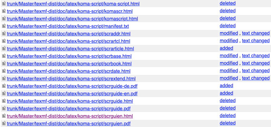 Danke, dass du den Rest lokal gelöst hast. Es ist natürlich ärgerlich, dass solche Änderungen unzählige Links (übrigens auch auf koma-script.de und im KOMA-Script Wiki) beschädigen. Auf der anderen Seite hat es aber für CTAN die Dinge extrem verbessert und mir von der Seite einiges an Kritik genommen.