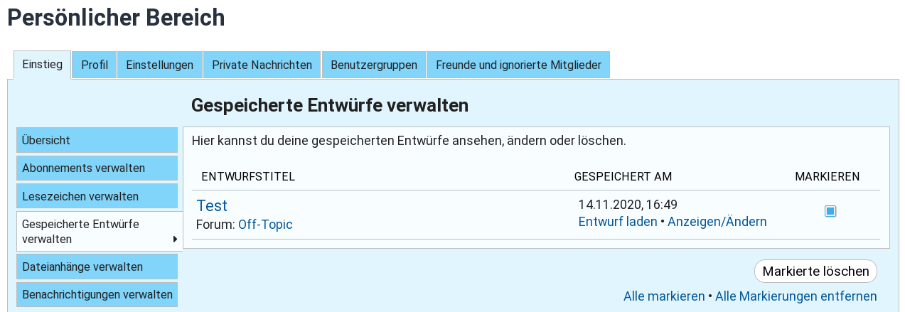 habe im Speicher für Entwürfe drei verschiedene Entwürfe gespeichert. Keiner davon soll weder geladen noch mittels des Absenden-Button zur Veröffentlichung gelangen. Das heißt doch, folglich wird auch keiner von den drei automatisch gelöscht.