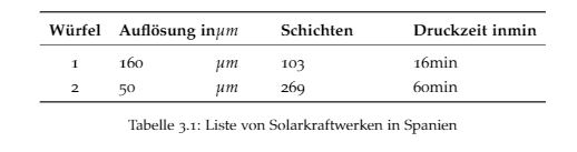 \bf Würfel & \bf Auflösung in & \bf Schichten & \bf Druckzeit in \\