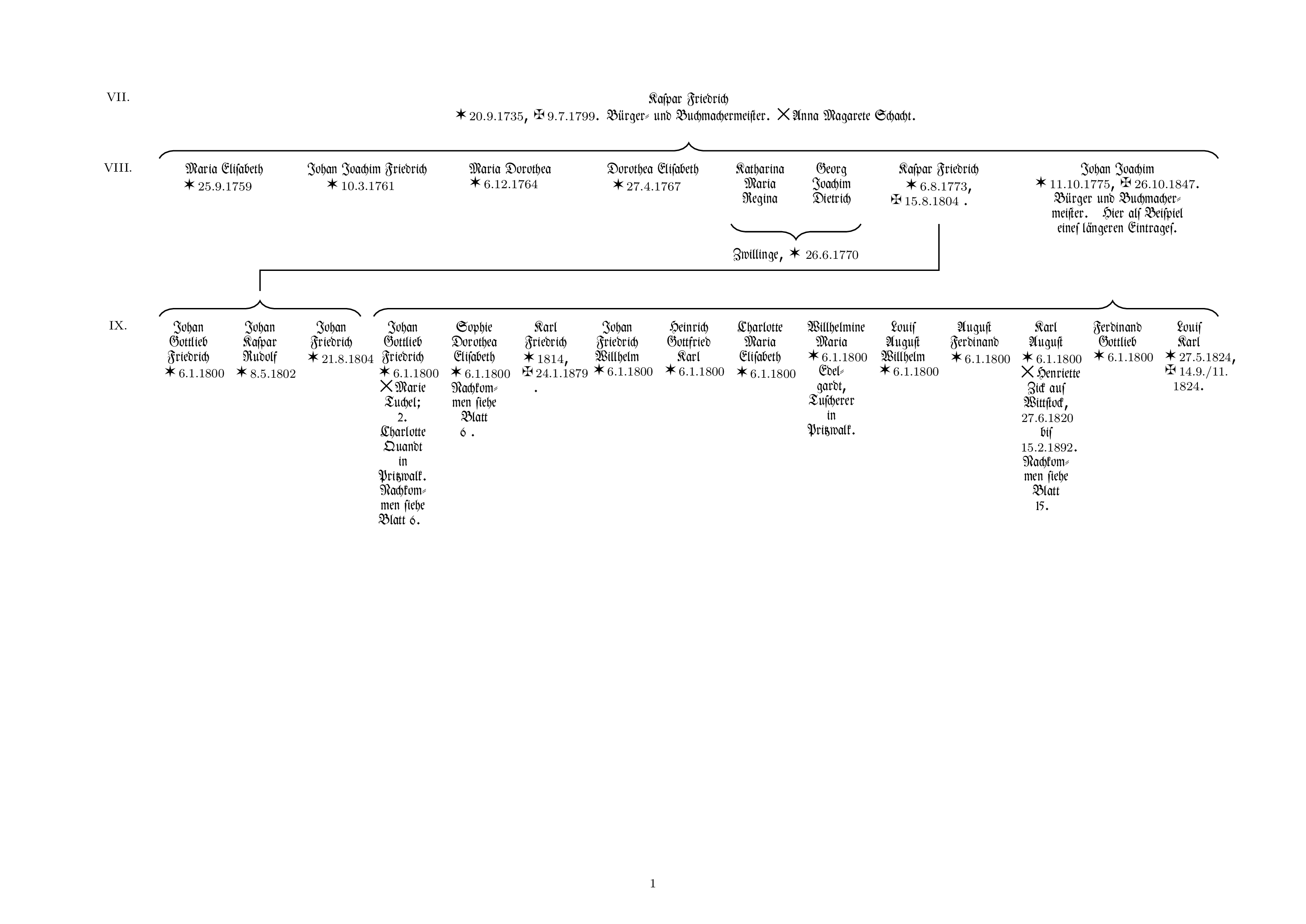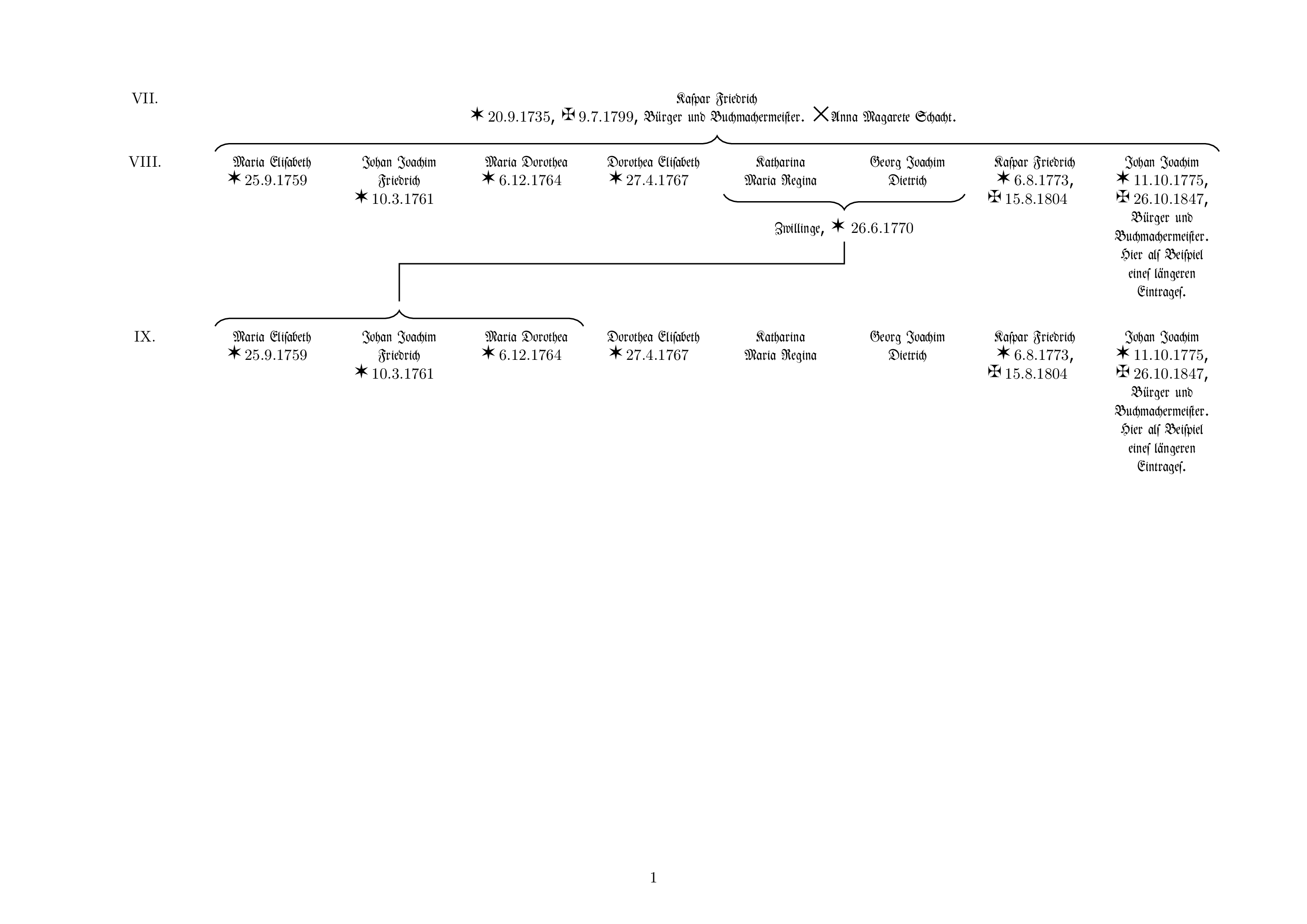 VIIIh, Johan Joachim, 11.10.1775, 26.10.1847,B{"u}rger und Buchmachermeister, , Hier als Beispiel eines l{"a}ngeren Eintrages. IXa, Johan Gottlieb Friedrich, 6.1.1800, , , ,