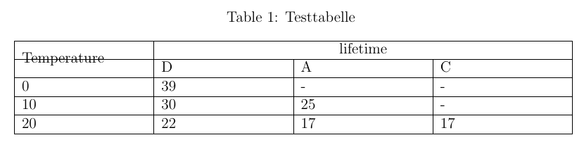 \end{document}Desweiteren hat die Verbindung der zwei Zeilen, in denen "Temperature" steht, nicht richtig geklappt. Zum einen ist hier "Temperature" nicht mittig (ist zu weit oben und zu weit links) und zum anderen verläuft die Linie auch durch die "verbundenen" Zellen. Weiß hier jemand, wie der Code richtig lauten muss?