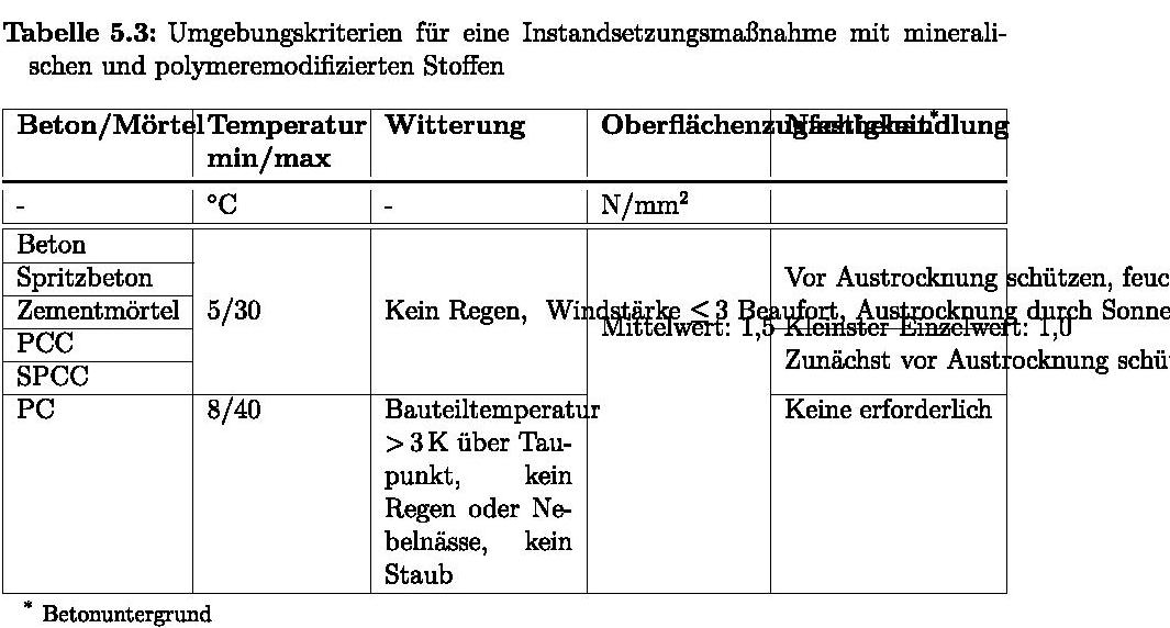 \captionabove{Umgebungskriterien für eine Instandsetzungsmaßnahme mit mineralischen und polymeremodifizierten Stoffen \cite{Raupach.2008}}