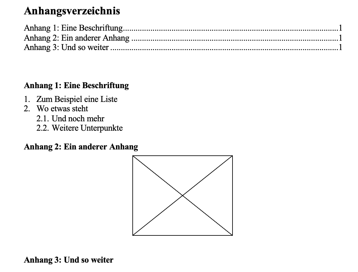 ich würde gerne ein Anhang erstellen mit automatischer Nummerierung und Verzeichnis. Letztlich sollte das ungefähr so aussehen, wie ich auf die schnelle in Word erstellt habe: