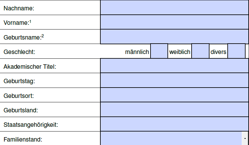 Familienstand:&\ChoiceMenu[combo, width=8.7cm, name=Familienstand, bordercolor={black}]{}{Ledig,Partnerschaft,Verheiratet,Geschieden,Verwitwet,Sonstiges}{}\\ \hline