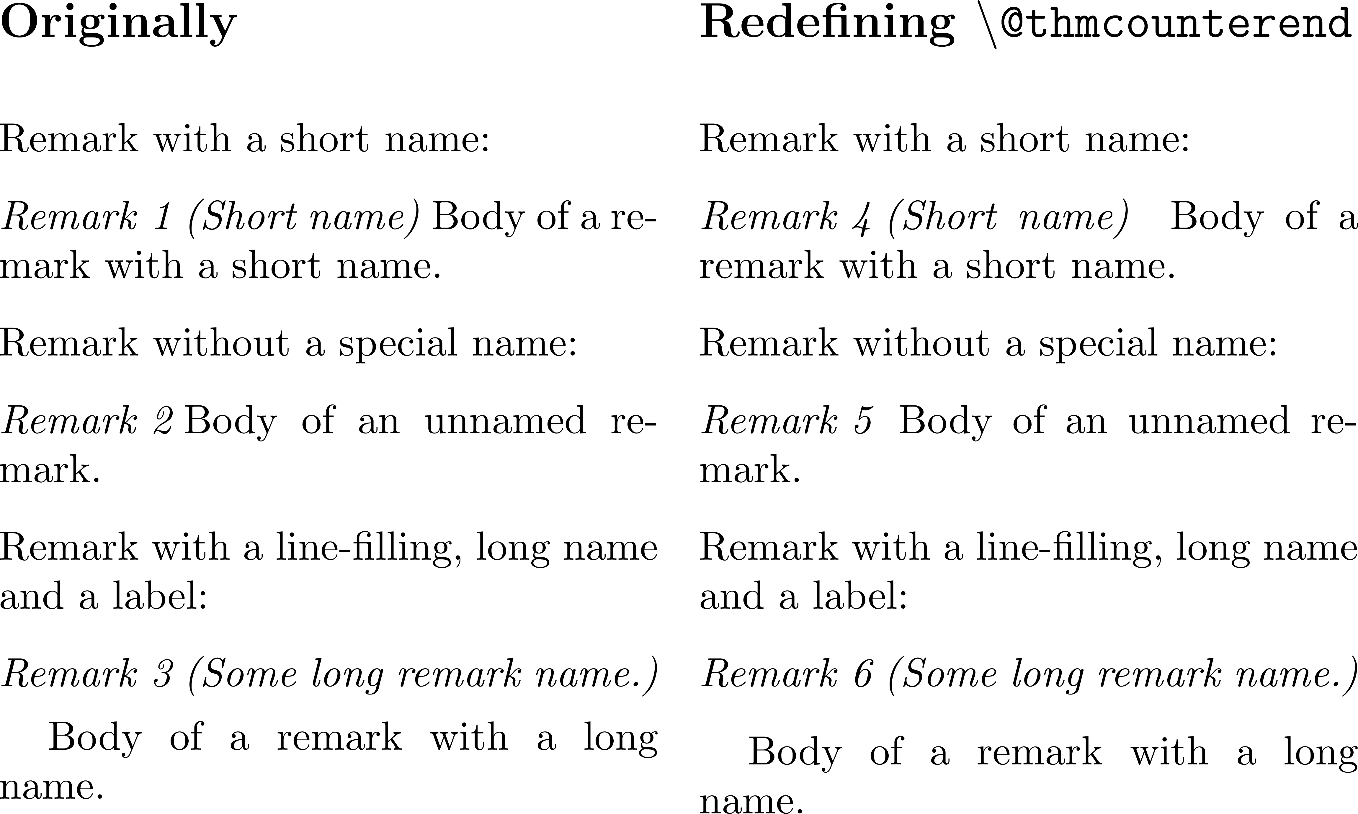 Definiert man \@thmcounterend auf einen Leerraum (\def\@thmcounterend{ } oder \def\@thmcounterend{\ } oder \def\@thmcounterend{\space}) um, entsteht eine unerwünschte Leerzeile nach einem zeilenlangen Kopf einer benannten Anmerkung. Definiert man \@thmcounterend so um, dass es der Leerraum lokal auf die doppelte Länge vergrößert (\def\@thmcounterend{\def\ {\hspace{2\fontdimen2\font plus2\fontdimen3\font minus2\fontdimen4\font}}}), so bleibt der horizontale Leerraum nach einer unbenannten Anmerkung klein wie ursprünglich. Definiert man \@thmcounterend so um, dass es zwischen den zwei Optionen oben auswählt (\def\@thmcounterend{\@ifnextchar\ {\hspace{2\fontdimen2\font plus2\fontdimen3\font minus2\fontdimen4\font}\@gobble}{ }}), so erhalten wir einen kleinen, aber merklichen vertikalen Leerraum nach einer Überschrift einer zeilenlangen benannten Anmerkung wie in Remark 6.